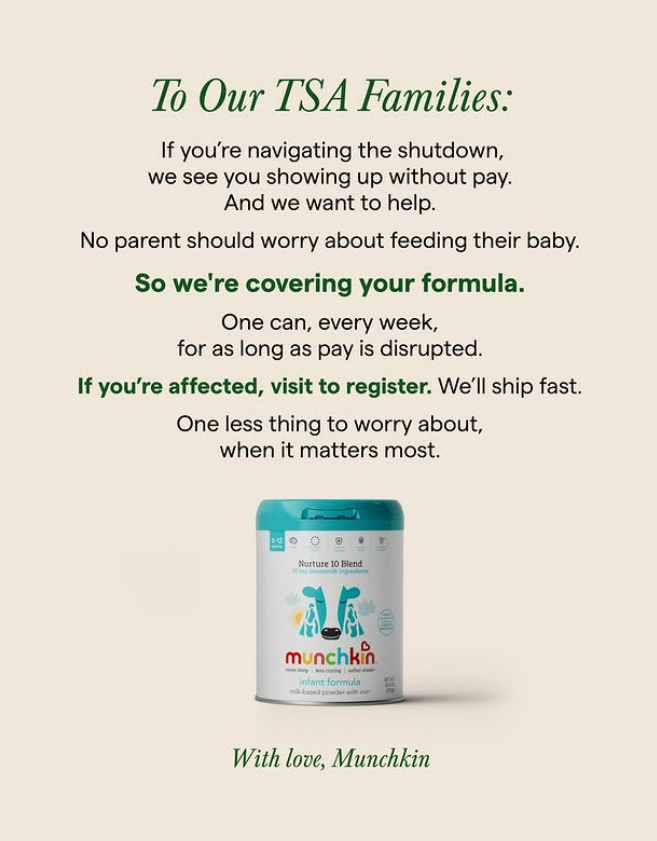 Munchkin, owned by WHY Brands Inc., said it started a TSA Formula Giveaway program to support families within the Transportation Security Administration who are facing current pay disruption.